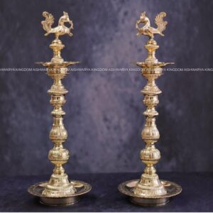 The Arch Varahi Vilakku with Lion Brass statue is a beautiful and symbolic lamp (vilakku) that depicts Goddess Varahi, an incarnation of Shakti, within an arch adorned with lion motifs. This unique brass lamp combines the blessings of divine protection, power, and illumination. Here’s an in-depth look at its features, symbolism, and significance: