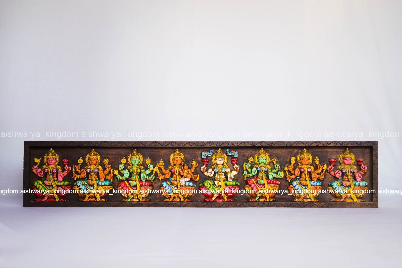 An Ashtalakshmi Horizontal Panel made from Mahogany wood would be a visually captivating and spiritually meaningful piece of art. Ashtalakshmi, the eight forms of Goddess Lakshmi, represent various aspects of wealth, prosperity, and abundance. These forms are widely revered in Hinduism and are often depicted in temple art, paintings, and sculptures. A horizontal panel would beautifully showcase the divine forms of the eight Lakshmis, arranged in a manner that captures the grace and blessings of each deity.