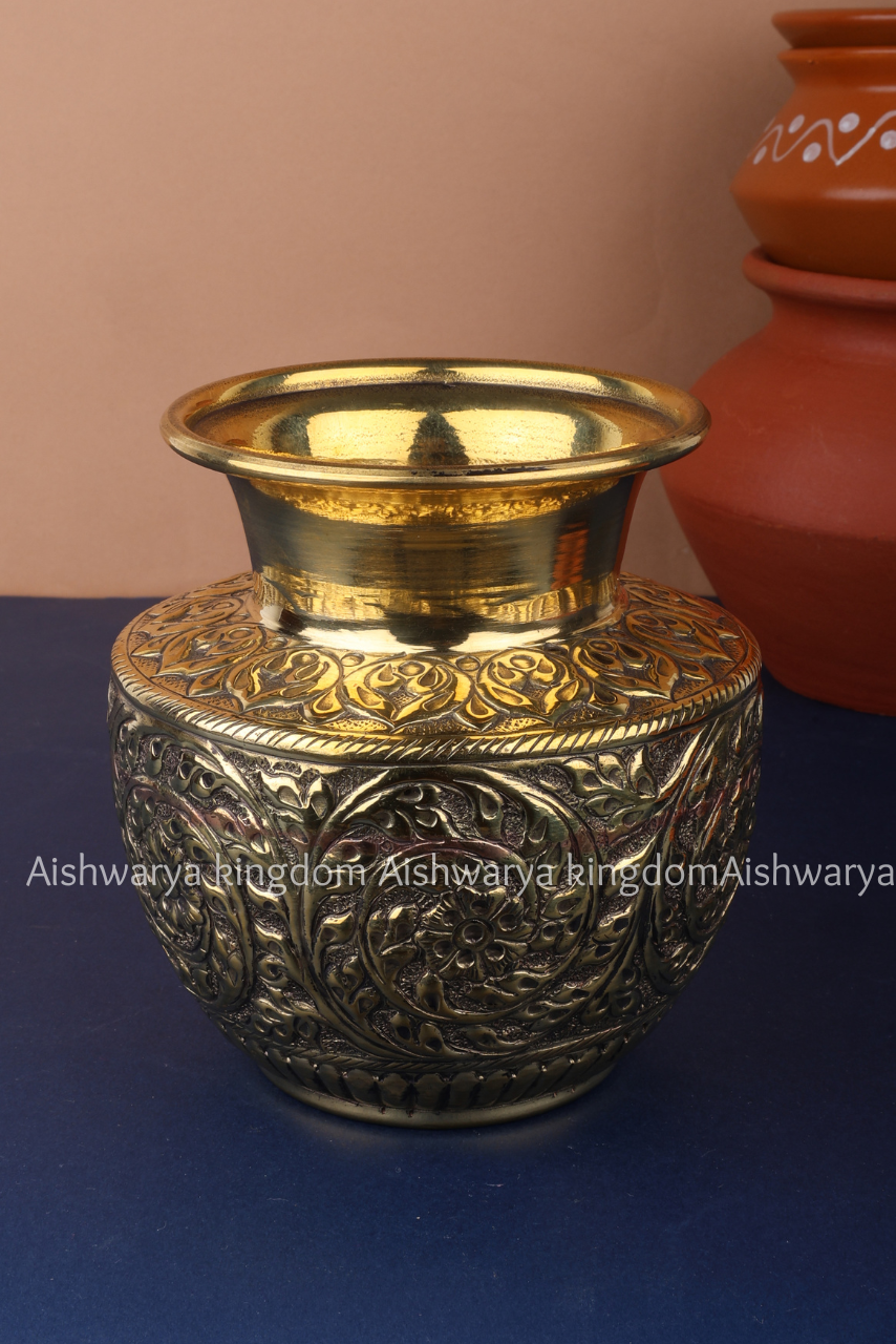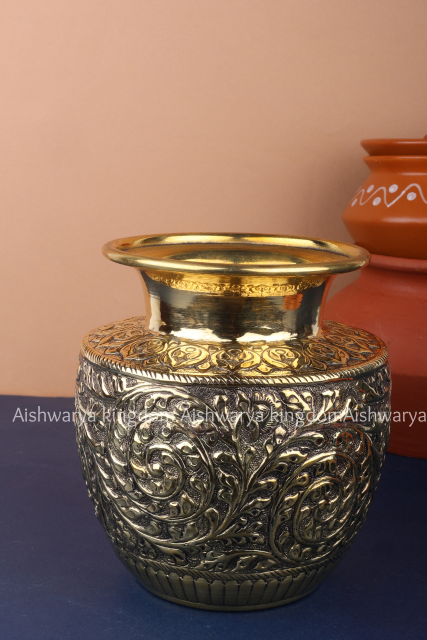The kalash holds deep cultural and spiritual significance, often used as a sacred vessel representing abundance and positive energy. Its artistic leaf design adds a decorative charm, allowing it to double as a stylish home decor piece when not in use.