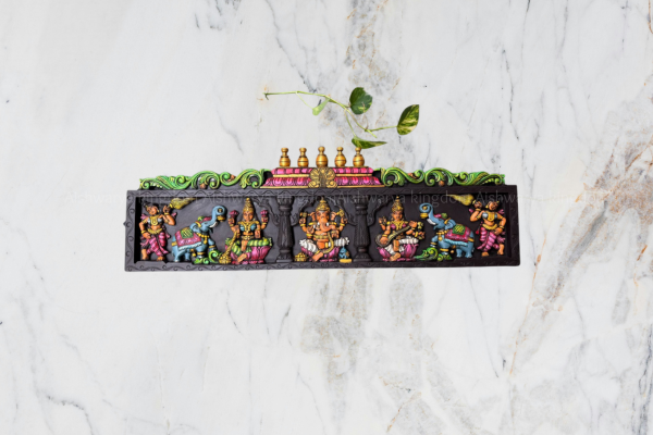 • Handcrafted wooden wall panel featuring Lakshmi, Saraswathi, and Vinayagar