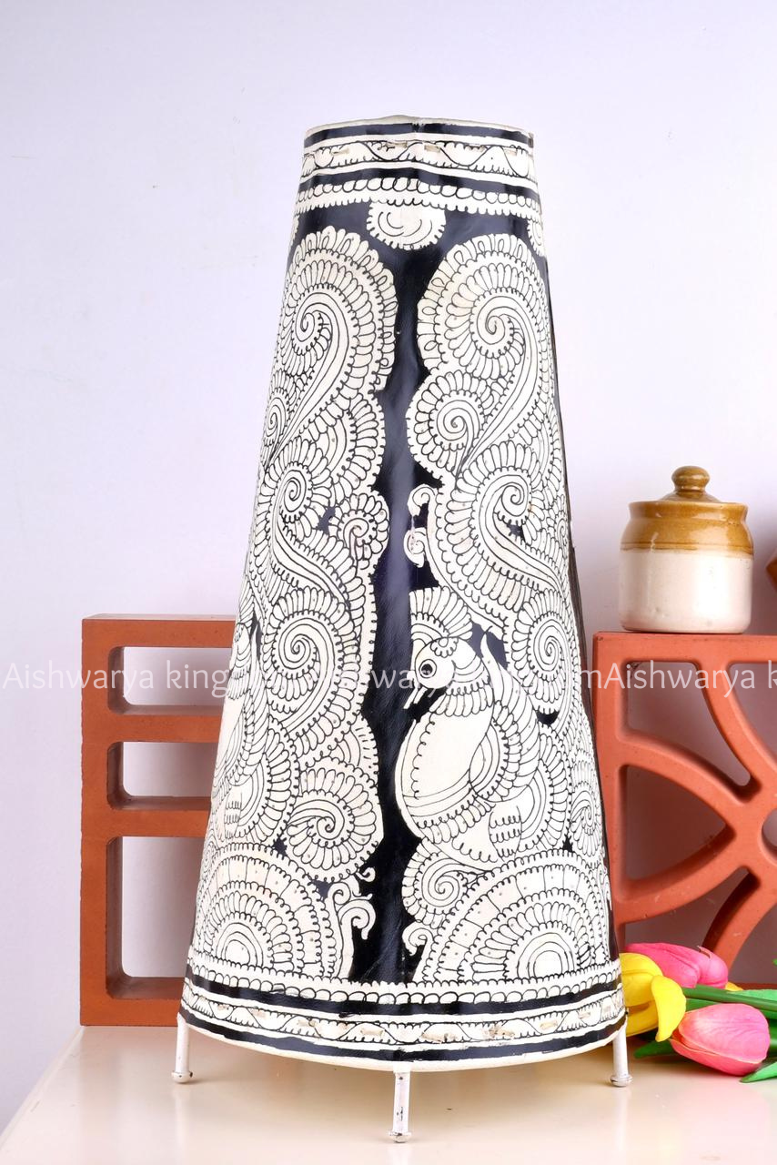 HANDICRAFT ROUND WHITE WITH BLACK ANNAM LEATHER PUPPET 16 INCH LAMP – RETURN GIFTS