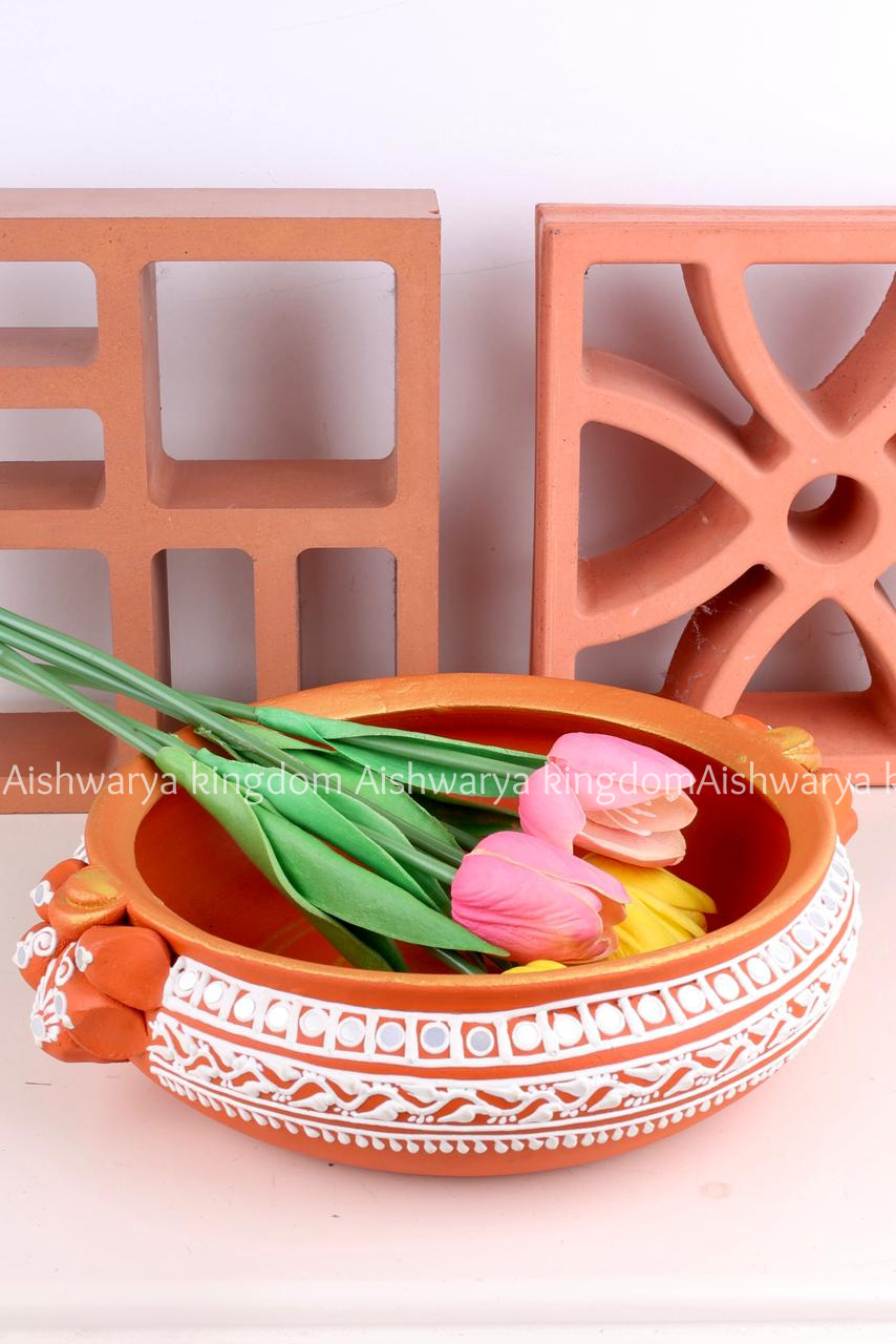 Compact yet dignified, the 5-inch size is perfect for tabletops, entryways, pooja rooms, and festive arrangements. Traditionally placed at thresholds or near sacred icons, the terracotta urli serves both as a ritual vessel and a vastu-aligned décor element, subtly grounding the environment.