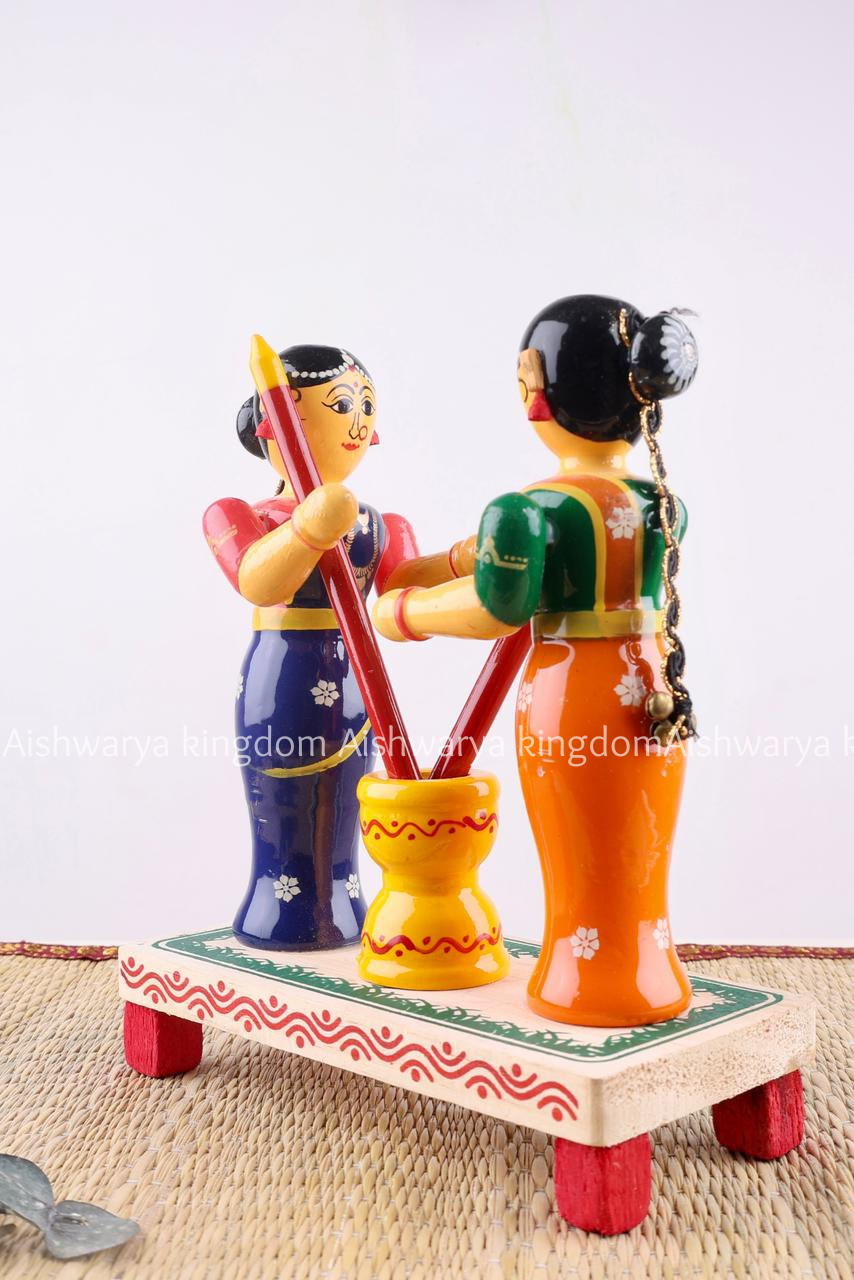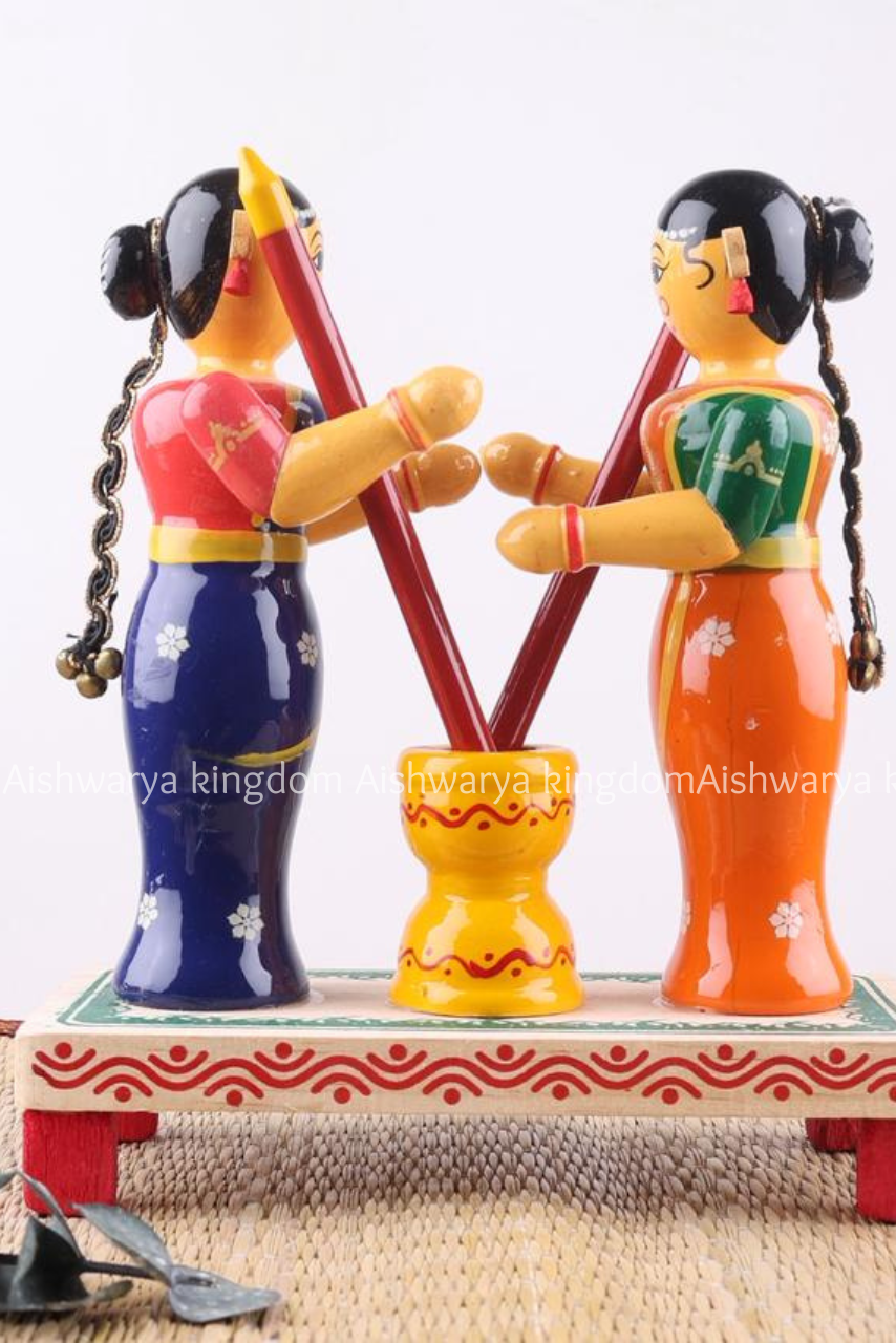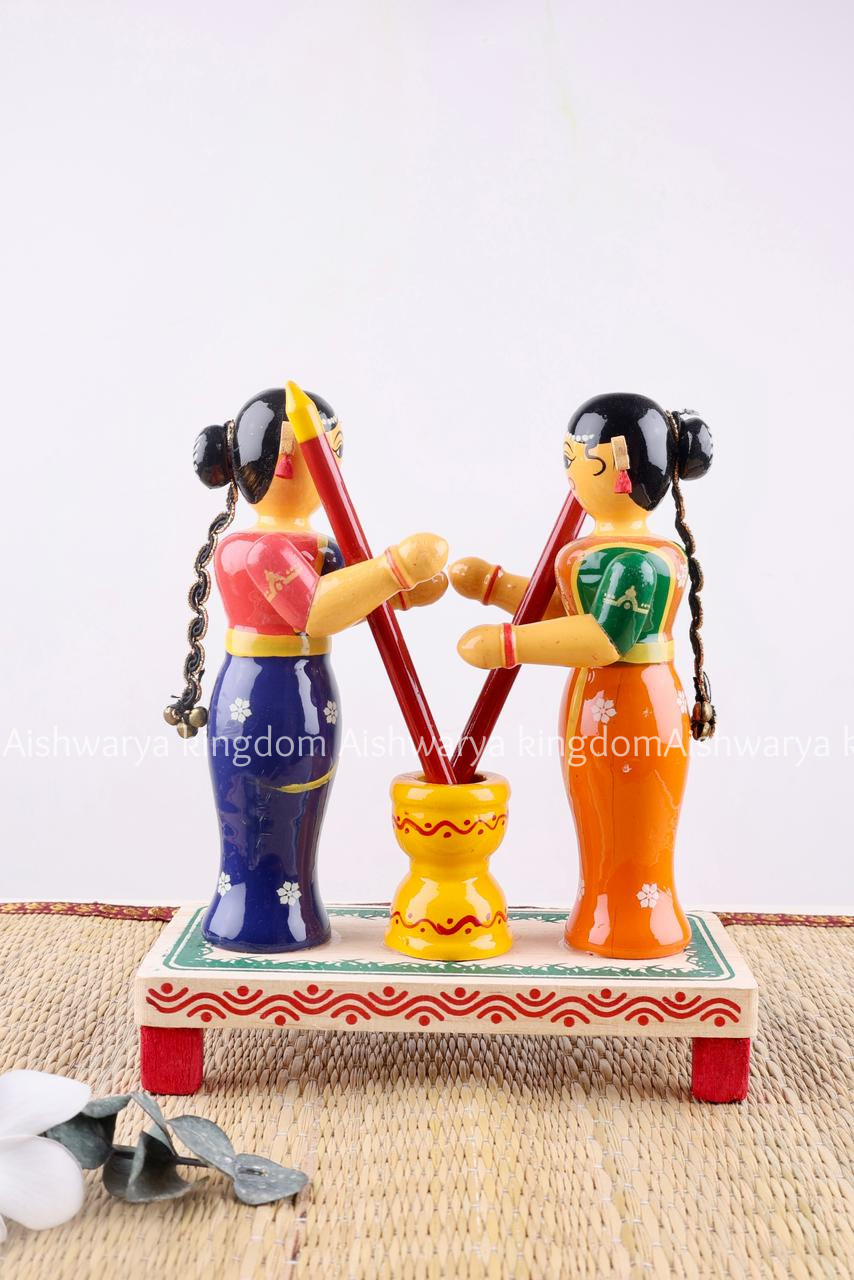 Each element of this scene is born from the 400-year-old Bommala Koluvu tradition. Artisans skillfully carve lightweight Tella Poniki wood into expressive figures before painting them with vibrant, non-toxic natural dyes. The attention to detail—from the synchronized posture of the girls and their traditional attire to the wooden mortar and scattered rice grains—creates a narrative that feels both authentic and alive.