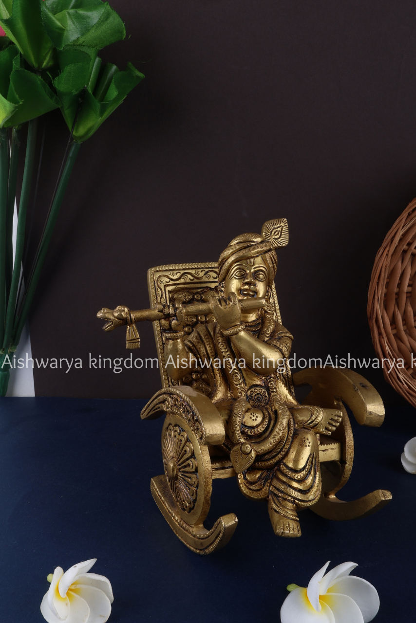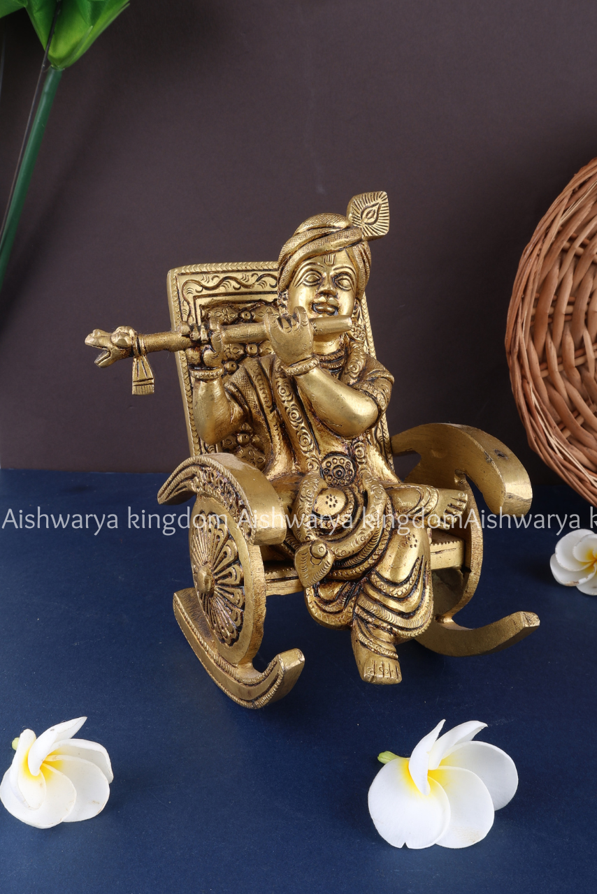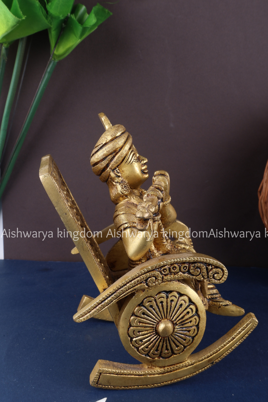 Bring divine elegance into your home with this exquisite Krishna Brass Statue Sitting on Swinging Chair Playing Flute from AK Crafts. This finely handcrafted piece captures Lord Krishna in a serene and graceful posture, seated on a traditional swing while playing his flute, symbolizing harmony, joy, and spiritual bliss.