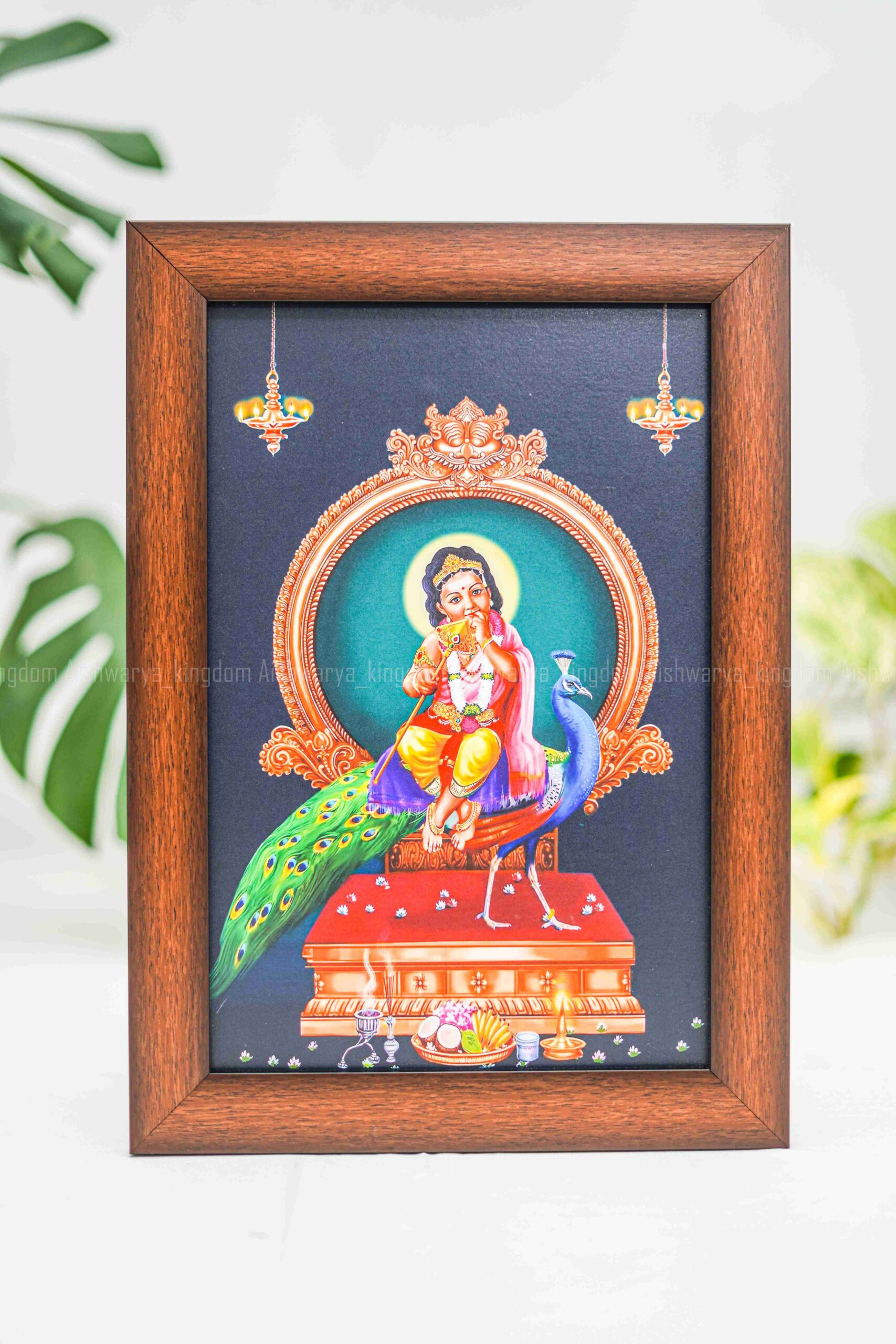 Design: The print typically features Lord Murugan in his peacock form, often adorned with traditional attire and jewelry, surrounded by lush landscapes that highlight his divine nature. The peacock symbolizes beauty and pride, making this portrayal especially vibrant.