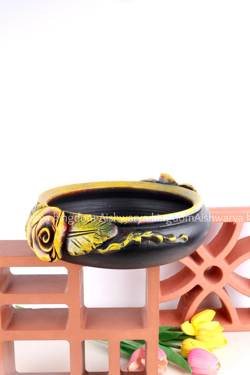 Add a touch of elegance and tradition to your home with this beautifully designed 8-inch Rose Urli. Crafted with a classic round shape and adorned with artistic rose detailing on the sides, this decorative urli enhances the charm of any space with its rich antique finish.