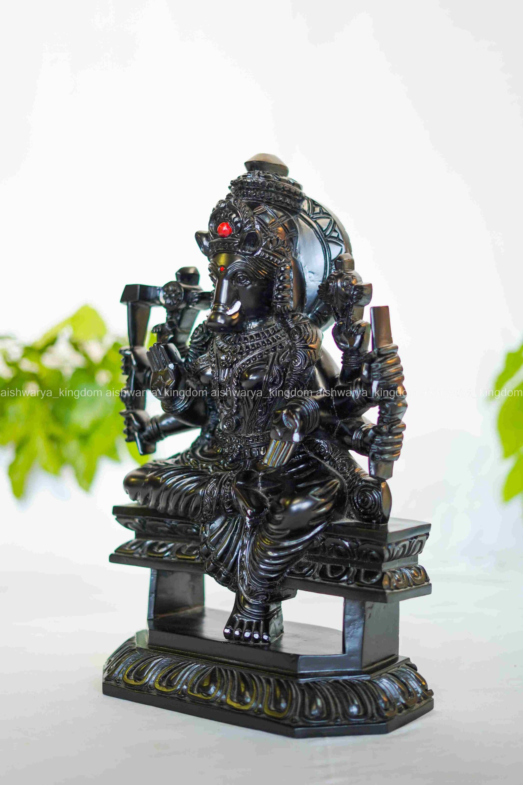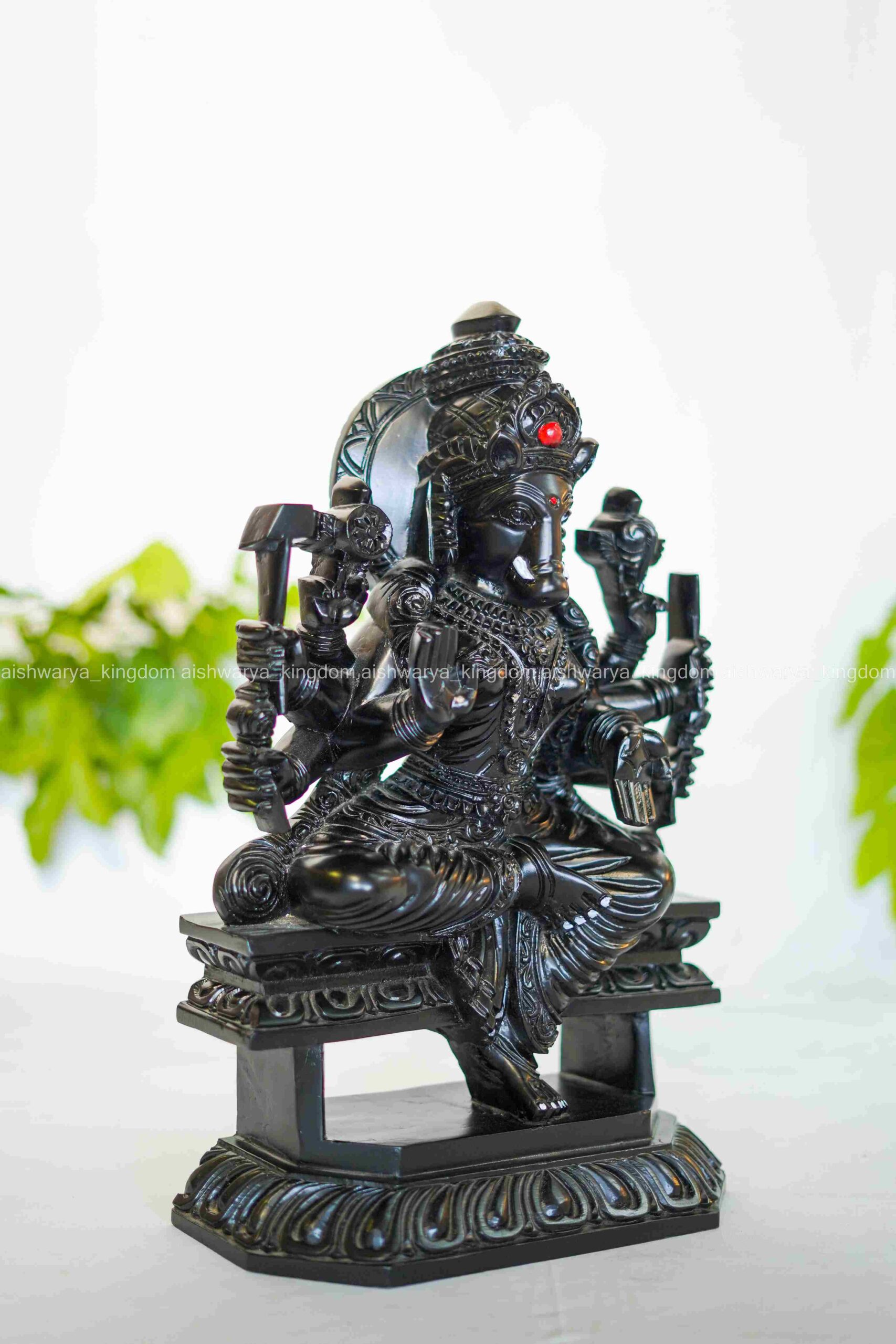 The “VARAHI” painting in a mahogany wood bracket portrays Goddess Varahi, the powerful and protective deity, in an elegant human form. Her figure is adorned with intricate jewelry and a richly detailed crown, symbolizing her royal and divine stature. Holding her gada (mace) with grace, she embodies both strength and compassion, exuding an aura of unwavering protection. The warm tones of the mahogany wood frame provide a beautiful contrast, enhancing the depth and reverence of the artwork. This piece is perfect for creating a sacred ambiance, embodying Varahi’s blessings of strength and courage.