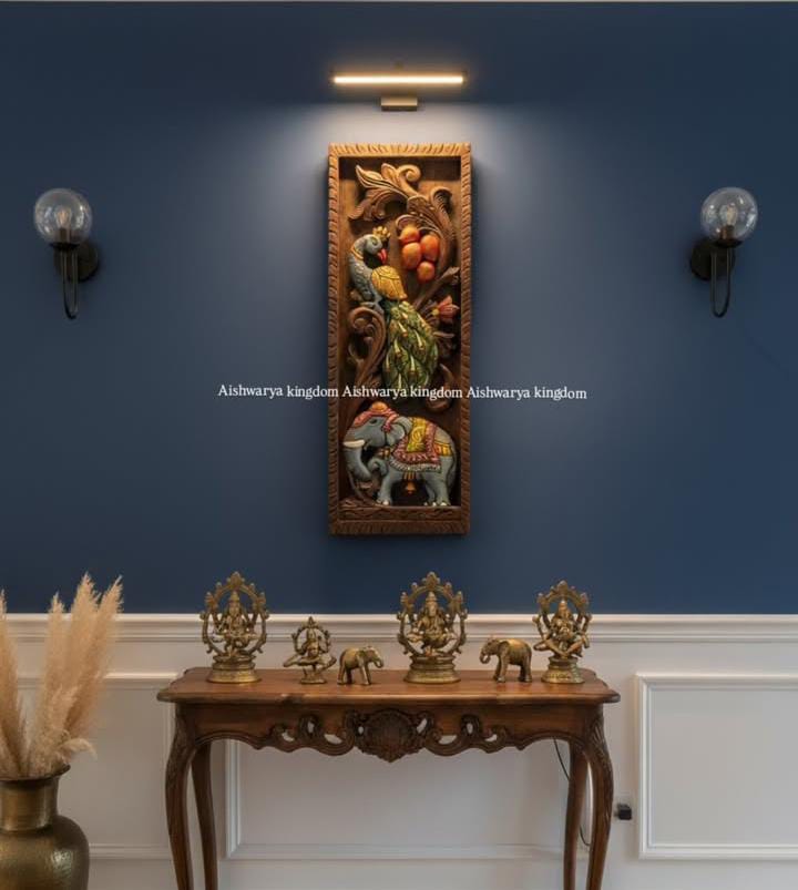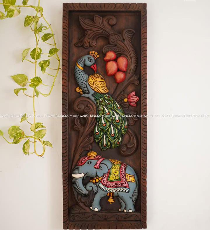 Hand-Carved: Crafted by skilled artisans, the panel features fine detailing on the peacock feathers, elephant features, and decorative elements such as floral patterns or borders.