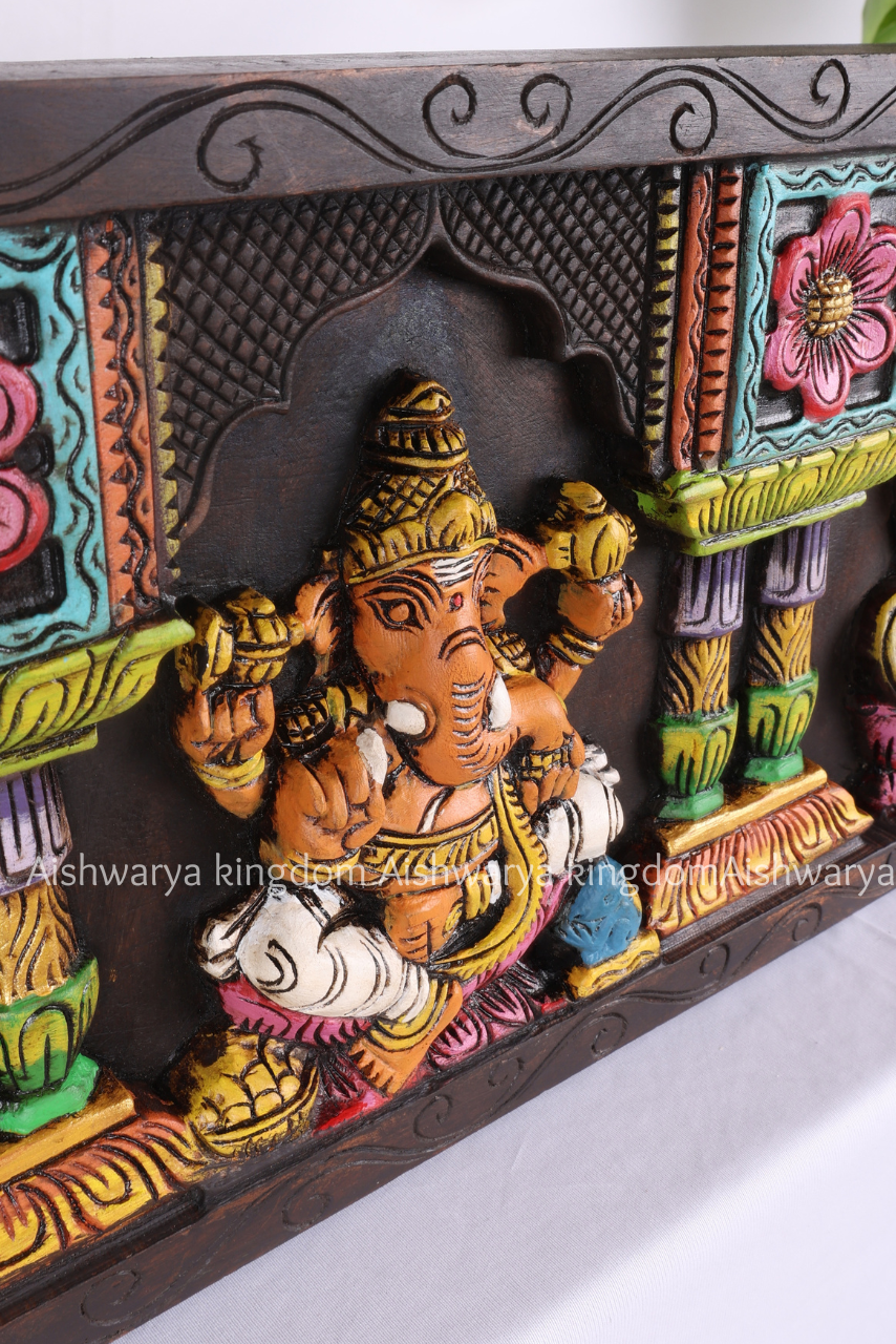 Bring home divine elegance with the Wooden Handcrafted Double Pillar 3 God Panel (2ft) by AK Crafts. Expertly crafted by skilled artisans, this panel showcases traditional craftsmanship with fine detailing that reflects cultural richness and spiritual essence.