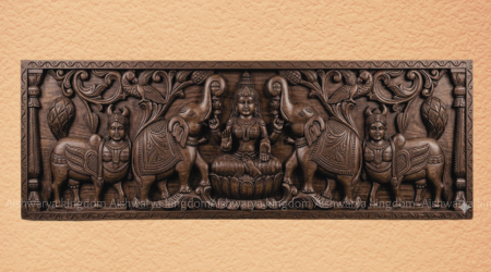 - Handcrafted wooden Gajalakshmi panel with Kamadhenu