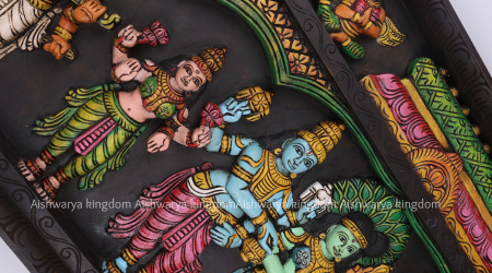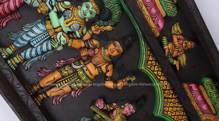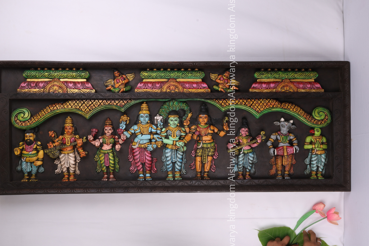 Expertly carved and enhanced with vibrant painted detailing, this wooden handcrafted panel reflects the richness of South Indian temple art and heritage craftsmanship. Every element is intricately designed to capture the grandeur and spiritual significance of the Thirukalyanam scene.