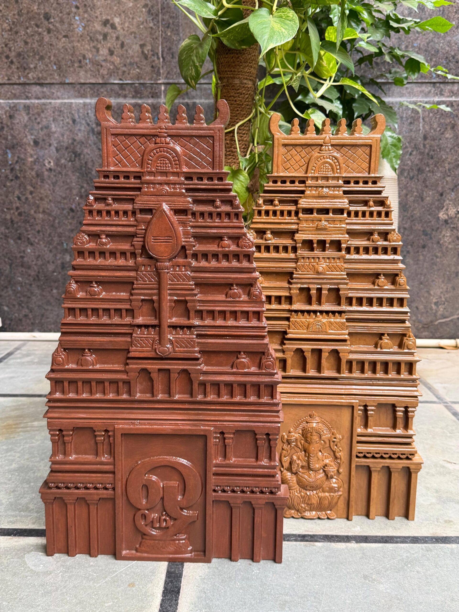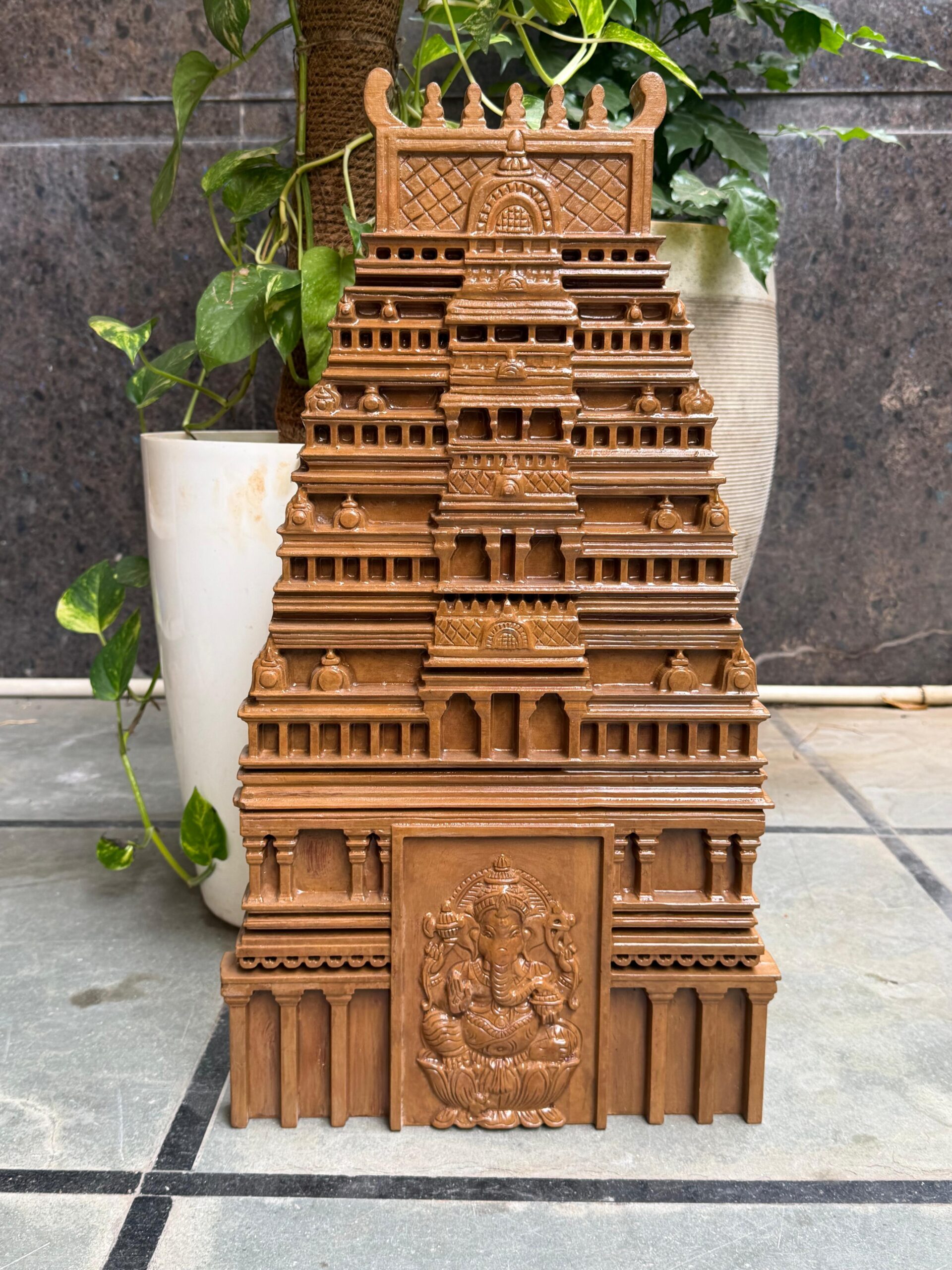 The Gopuram structure symbolizes positivity, prosperity, and divine protection. Its layered carvings and temple motifs create a sacred atmosphere, making it ideal for Vaastu-friendly home décor.