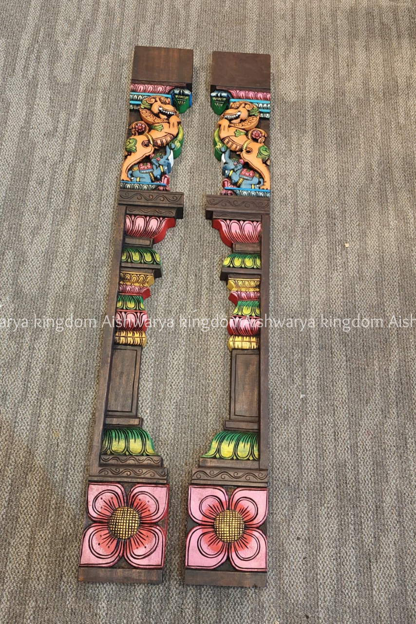 Perfect for gifting, festive occasions, or enhancing sacred spaces, this wall mount adds cultural richness, elegance, and devotion to your interiors. Transform your walls with this wooden handcrafted Yazhi with Elephant side pillar wall mount, creating a spiritually uplifting and timeless environment in your home.
